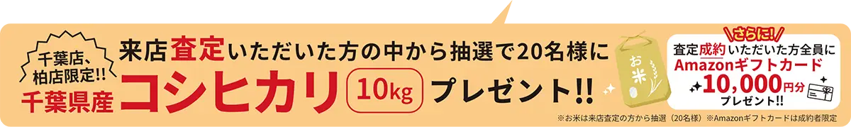 ※当社にて来店査定を受けられた方の中から抽選で20名様にプレゼントいたします。※お米は査定当日にその場でお渡しいたします。※在庫がなくなり次第、キャンペーンは終了となります。※ご当選された方には、当日の様子を写真撮影させていただく場合がございます。撮影した写真は、弊社の店頭・SNS・WEBサイト等に掲載させていただくことがございますので、あらかじめご了承ください。